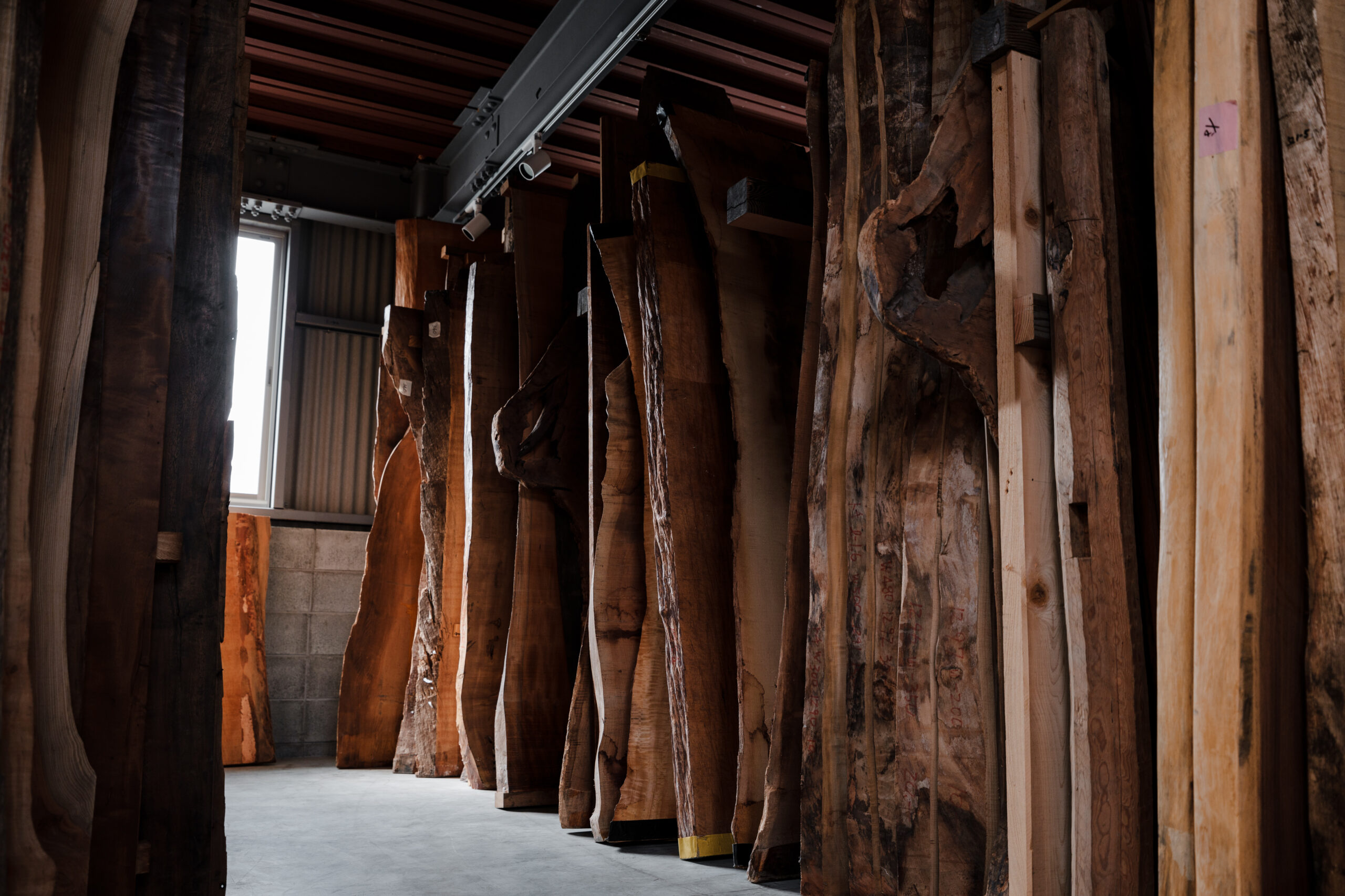 倉庫4つ分、豊富なストックの銘木を選んで