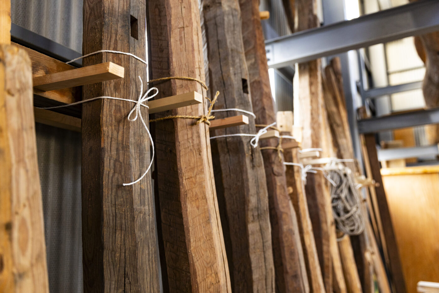 古民家で使われてきた梁や柱は、何十年、時には百年以上もの間、建物を支えながら乾燥と収縮を繰り返し、現在の木材にはない安定性と存在感を備えています。
