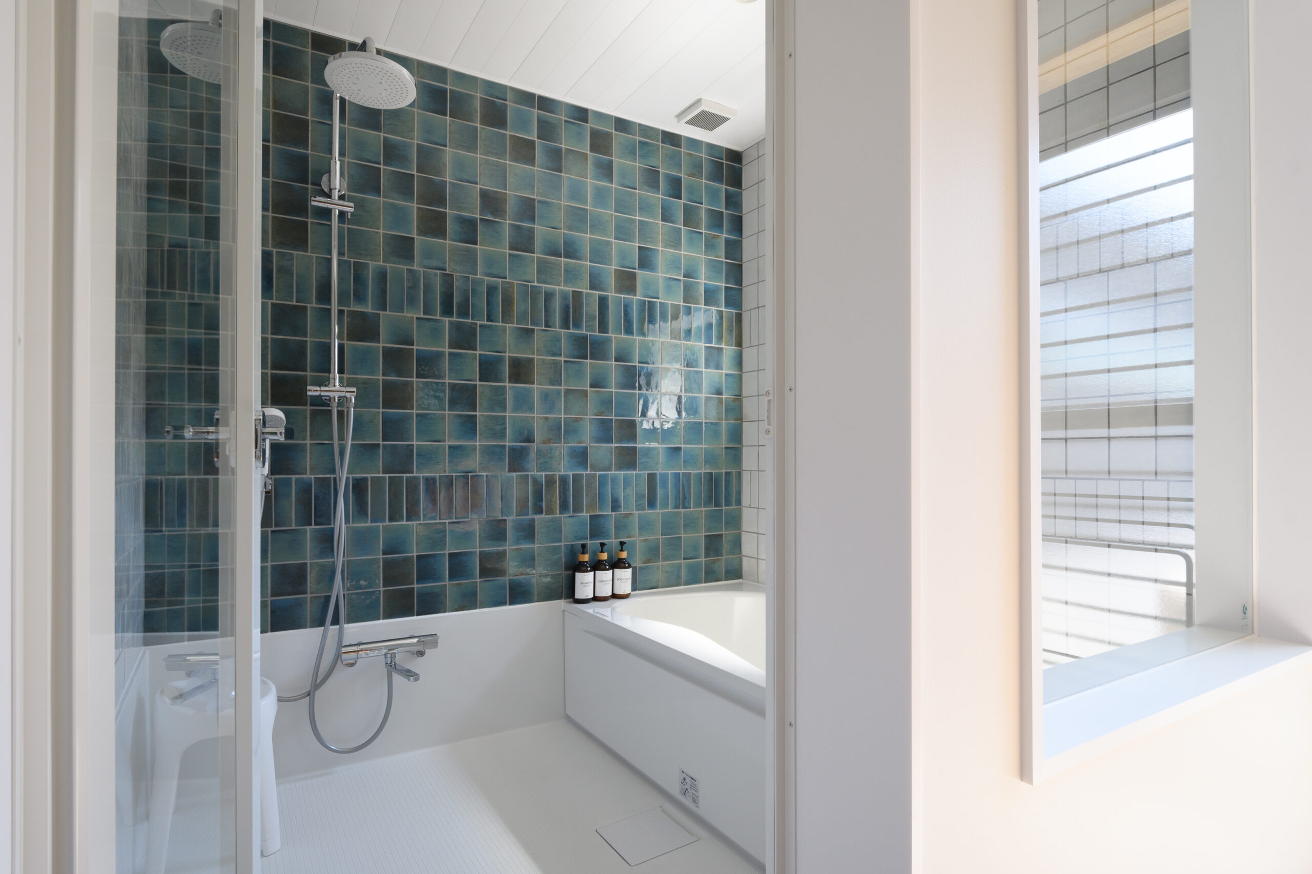 テーマカラーである青のタイル仕上げとすることで、落ち着きつつも爽やかな雰囲気で来訪者を迎えます。
