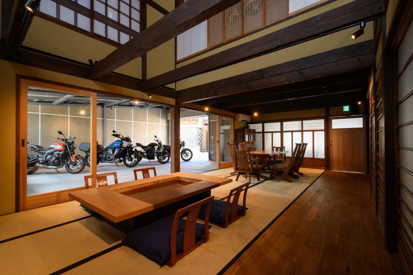 宿の一番の特徴でもある、ガレージと隣接した広々リビング。