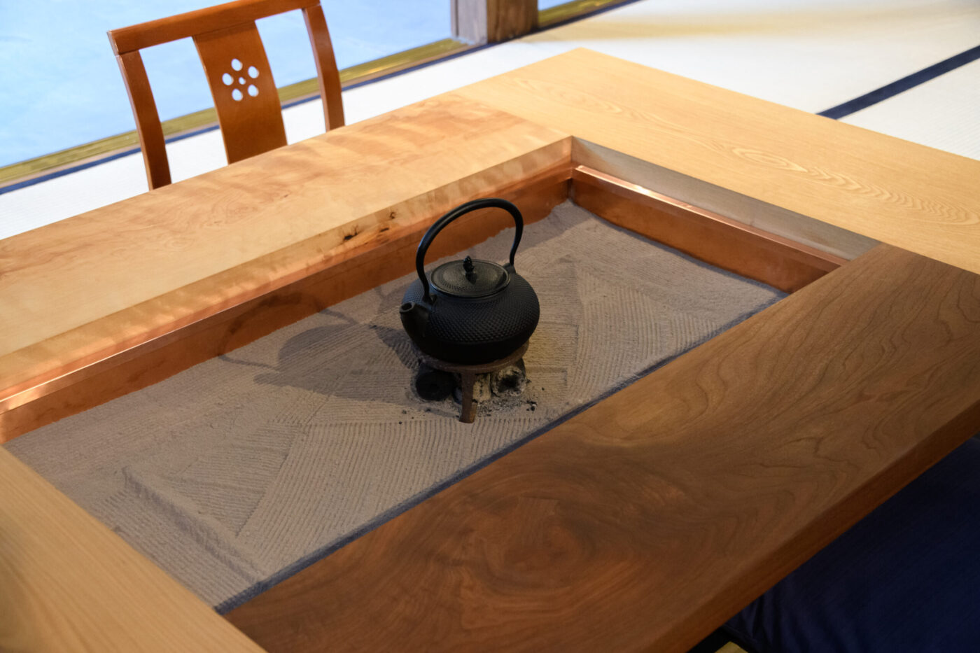 大工職人による造作の囲炉裏テーブル。様々な樹種でつくられた天板がこだわりポイント。