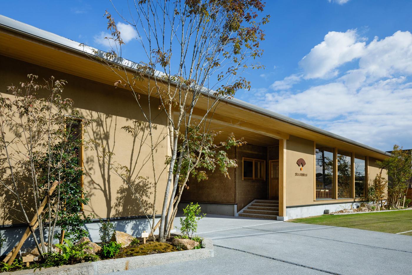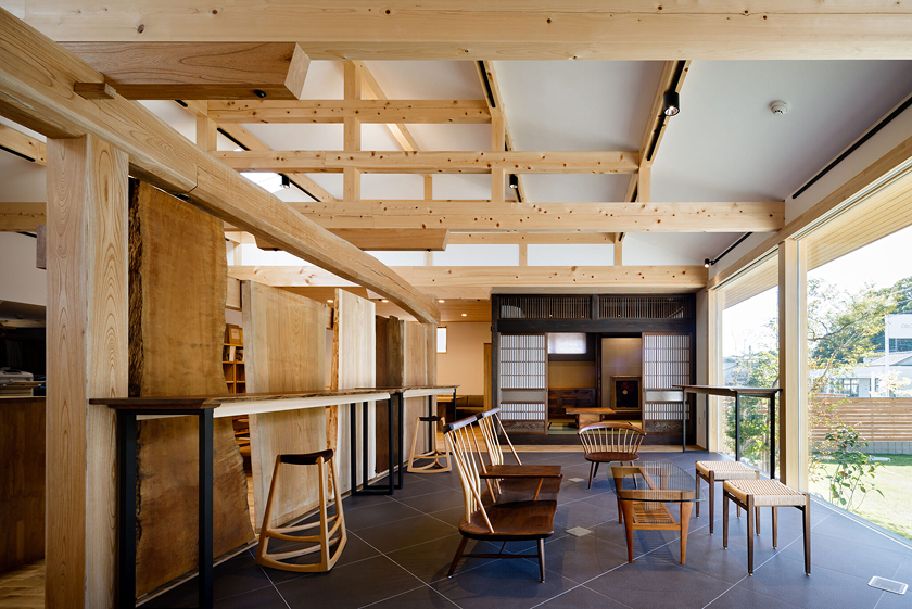 ヒノキ丸太の小屋組がシンボルとなる、木造平屋のショールームです。